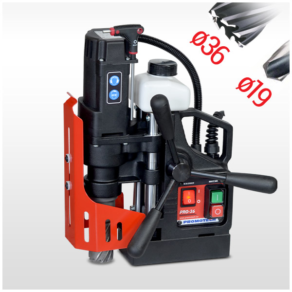A PRO-36 mágnestalpas fúrógép akár 36 mm átmérőjű furatokat készít magfúróval és 12mm átmérőjű furatokat 19 mm-es (3/4") Weldon befogású csigafúróval. A kompakt kialakítás és a kiváló súly/teljesítmény arány miatt ez a magfúró nagyon népszerű választás a vásárlók körében.