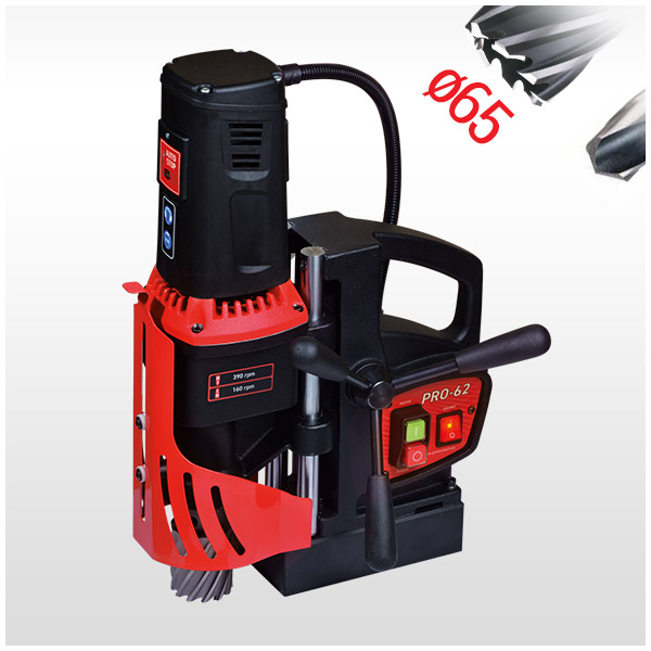 A PRO-62 mágnestalpas fúrógép 19mm-es Weldon befogóval TCT és HSS vágó- és fúró szerszámokat használ, melyek gyűrű alakú hornyot vágnak a furat szélén és egy tömör magot hagynak középen. Az erős motorral akár Ø65mm-es magfúróval 75mm vágási mélységgel is lehet dolgozni. Karbantartást nem igénylő, kettős vezetőrudas sínvezető rendszer biztosítja a zökkenőmentes működést.