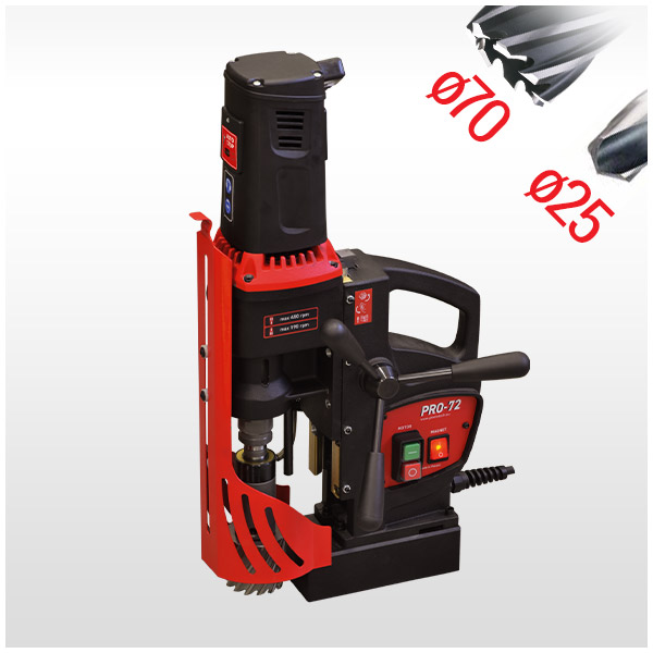 A PRO-72 rendkívül nagy teljesítményű, kétfokozatú magfúró, amely akár 70 mm-es marást és 25 mm-es fúrást tesz lehetővé. Az innovatív, könnyű intelligens mágnesnek köszönhetően a PRO-72 mindössze 18,0 kg. Merev kialakítása meghosszabbítja a szerszám élettartamát, a félautomata szögbeállítás lehetővé teszi az egyszerű, gyors és pontos működést néhány egyszerű lépésben.